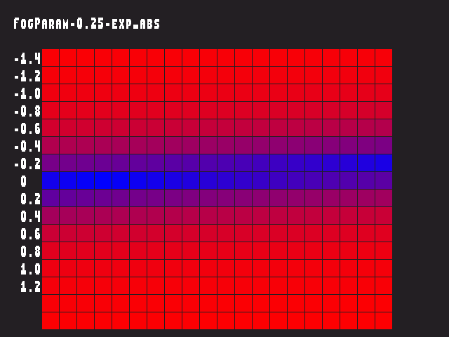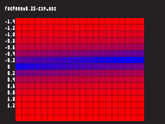 Tests fog mode NV097_SET_FOG_MODE_V_EXP_ABS with the bias param set to the zero point for the type and the multiplier set to 0.25. Quads are rendered with fog coordinates starting at -1.4 and increasing by 0.01 per quad.