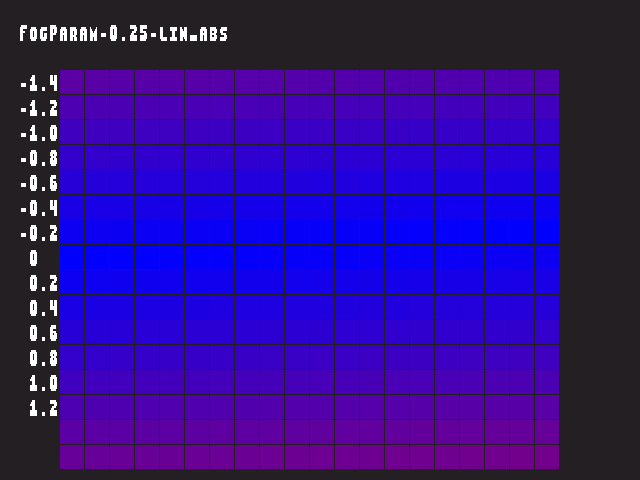 Tests fog mode NV097_SET_FOG_MODE_V_LINEAR_ABS with the bias param set to the zero point for the type and the multiplier set to 0.25. Quads are rendered with fog coordinates starting at -1.4 and increasing by 0.01 per quad.