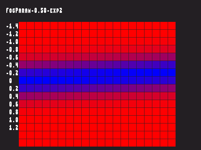 Tests fog mode NV097_SET_FOG_MODE_V_EXP2 with the bias param set to the zero point for the type and the multiplier set to 0.50. Quads are rendered with fog coordinates starting at -1.4 and increasing by 0.01 per quad.