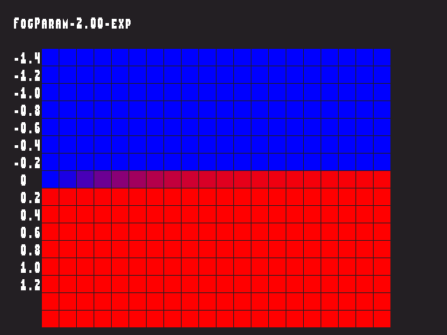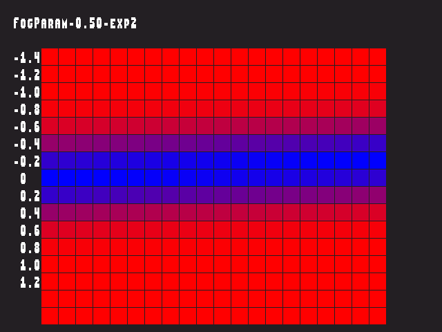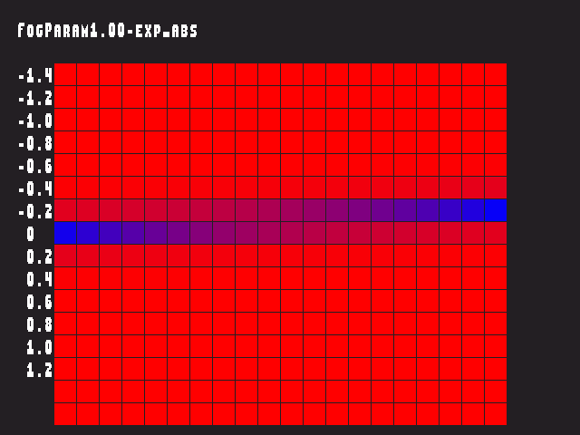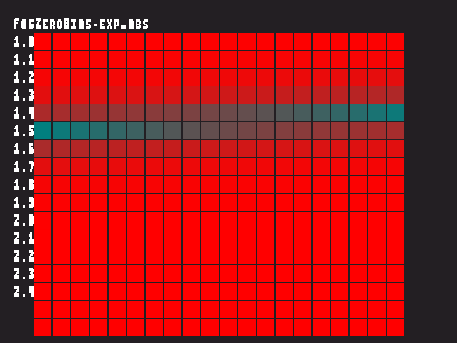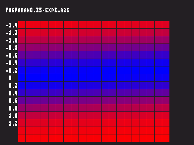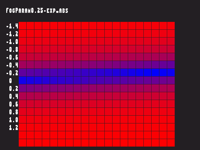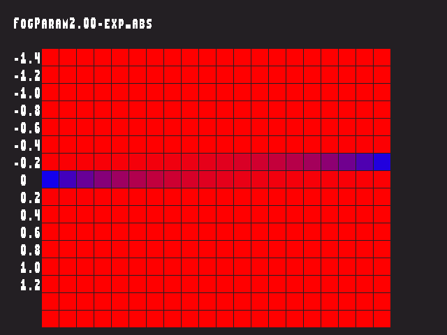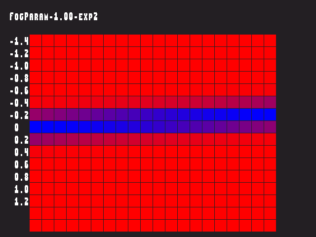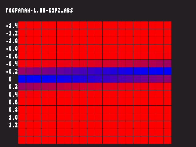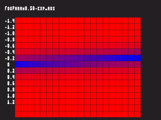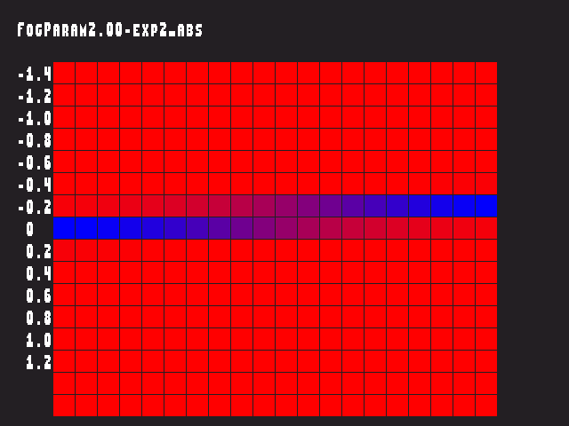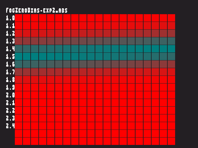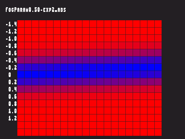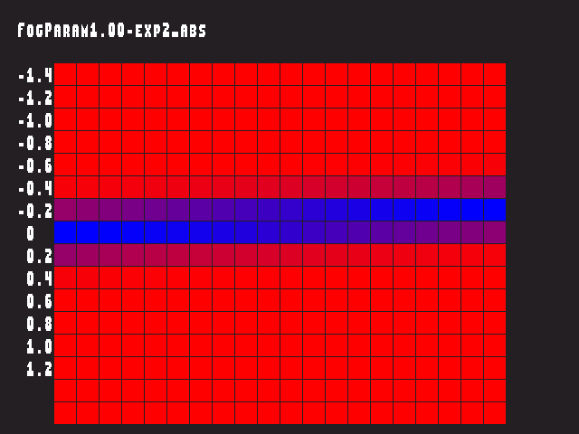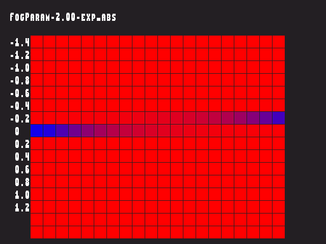 Tests fog mode NV097_SET_FOG_MODE_V_EXP2_ABS with the bias param set to the zero point for the type and the multiplier set to XXXX. Quads are rendered with fog coordinates starting at -1.4 and increasing by 0.01 per quad.