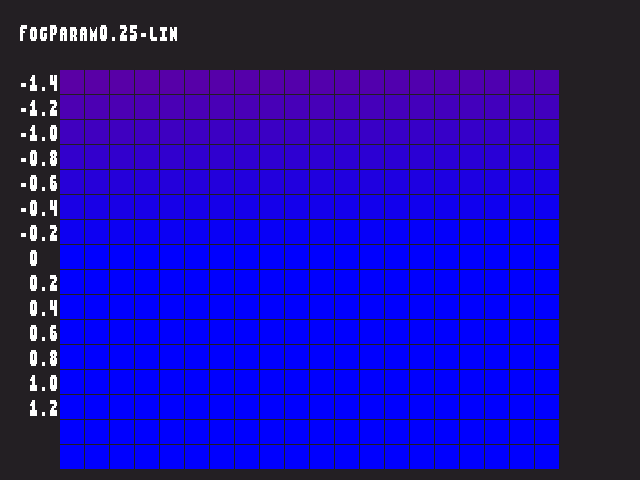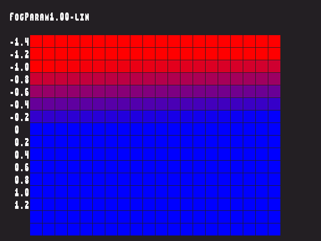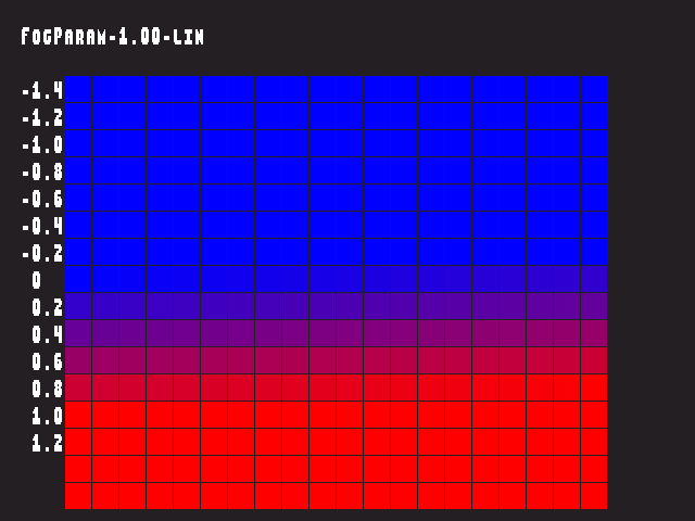 Tests fog mode NV097_SET_FOG_MODE_V_LINEAR with the bias param set to the zero point for the type and the multiplier set to 1.0. Quads are rendered with fog coordinates starting at -1.4 and increasing by 0.01 per quad.