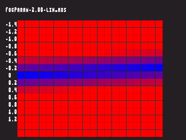 Tests fog mode NV097_SET_FOG_MODE_V_LINEAR_ABS with the bias param set to the zero point for the type and the multiplier set to 2.0. Quads are rendered with fog coordinates starting at -1.4 and increasing by 0.01 per quad.