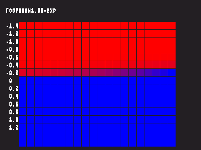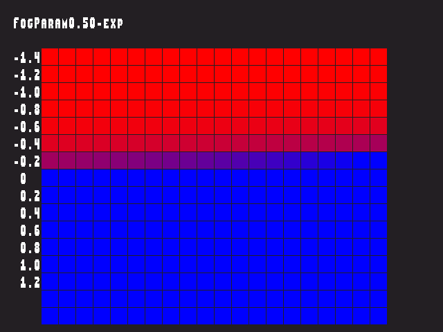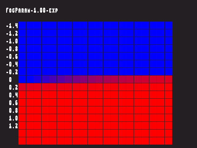 Tests fog mode NV097_SET_FOG_MODE_V_EXP with the bias param set to the zero point for the type and the multiplier set to 1.0. Quads are rendered with fog coordinates starting at -1.4 and increasing by 0.01 per quad.
