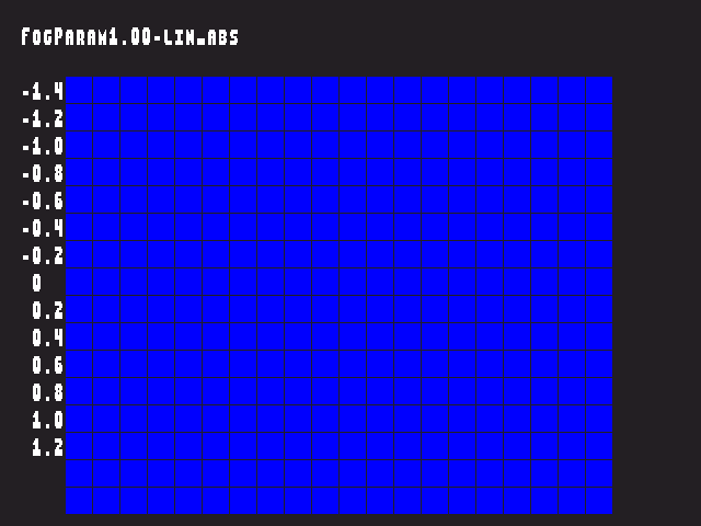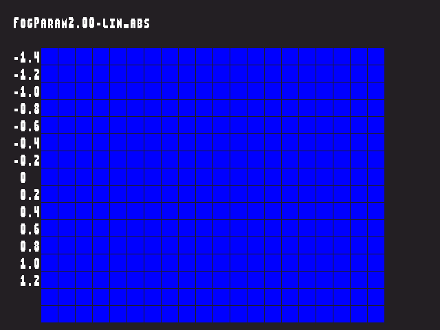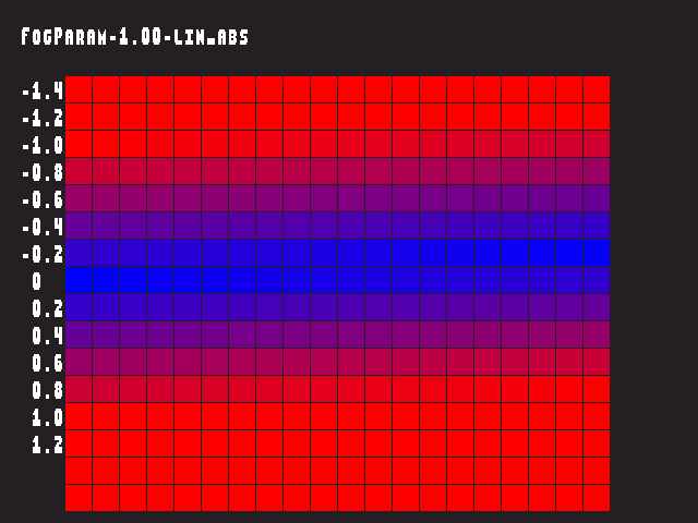 Tests fog mode NV097_SET_FOG_MODE_V_LINEAR_ABS with the bias param set to the zero point for the type and the multiplier set to 1.0. Quads are rendered with fog coordinates starting at -1.4 and increasing by 0.01 per quad.