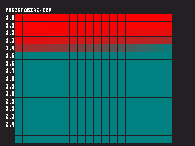 Tests the bias parameter for NV097_SET_FOG_MODE_V_EXP2. Renders a series of quads and increments the bias fog param by 0.005 for each, starting at 1.0. The multiplier params are set to 0 so the fog coord (1.0) is irrelevant.