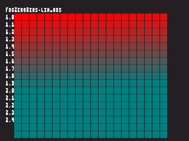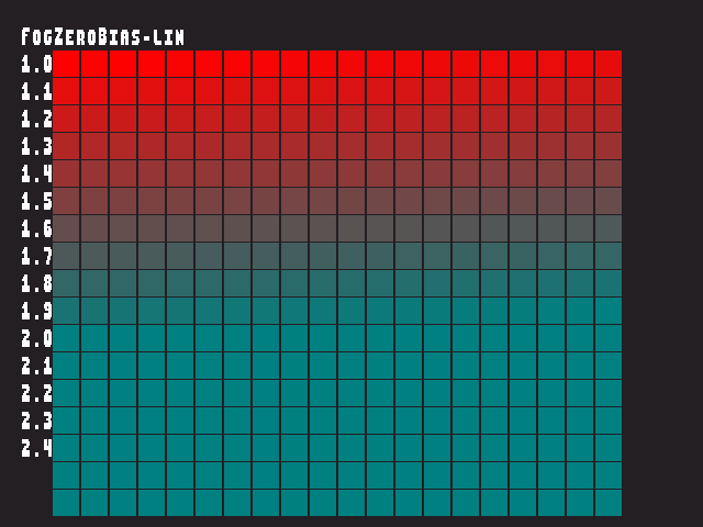 Tests the bias parameter for NV097_SET_FOG_MODE_V_LINEAR_ABS. Renders a series of quads and increments the bias fog param by 0.005 for each, starting at 1.0. The multiplier params are set to 0 so the fog coord (1.0) is irrelevant.