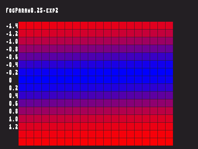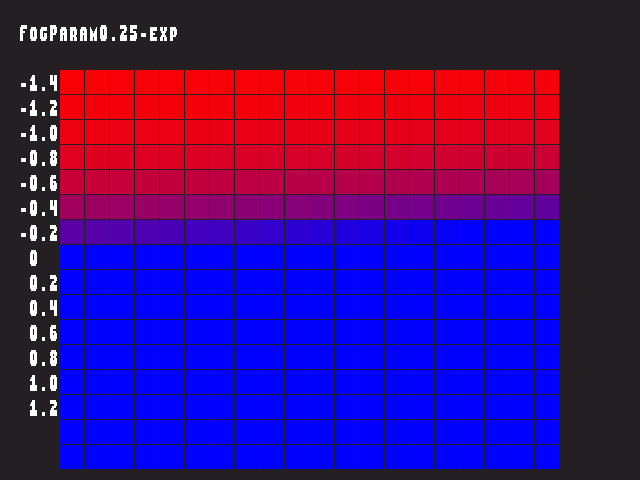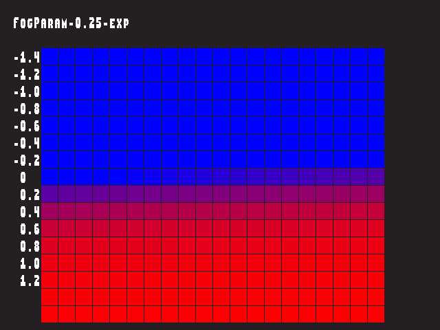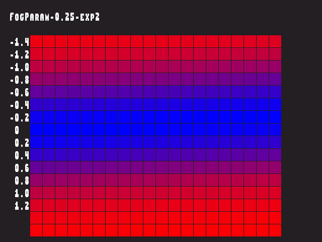 Tests fog mode NV097_SET_FOG_MODE_V_EXP2 with the bias param set to the zero point for the type and the multiplier set to 0.25. Quads are rendered with fog coordinates starting at -1.4 and increasing by 0.01 per quad.
