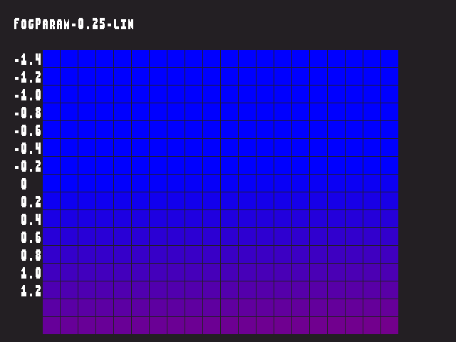 Tests fog mode NV097_SET_FOG_MODE_V_LINEAR with the bias param set to the zero point for the type and the multiplier set to 0.25. Quads are rendered with fog coordinates starting at -1.4 and increasing by 0.01 per quad.