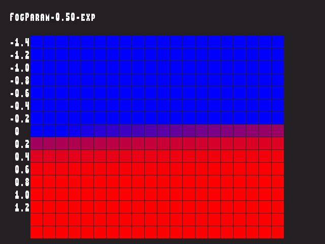 Tests fog mode NV097_SET_FOG_MODE_V_EXP with the bias param set to the zero point for the type and the multiplier set to 0.50. Quads are rendered with fog coordinates starting at -1.4 and increasing by 0.01 per quad.