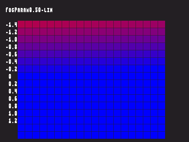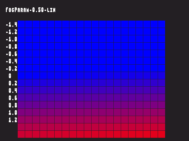 Tests fog mode NV097_SET_FOG_MODE_V_LINEAR with the bias param set to the zero point for the type and the multiplier set to 0.50. Quads are rendered with fog coordinates starting at -1.4 and increasing by 0.01 per quad.