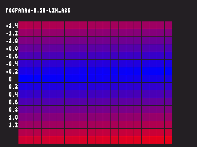 Tests fog mode NV097_SET_FOG_MODE_V_LINEAR_ABS with the bias param set to the zero point for the type and the multiplier set to 0.50. Quads are rendered with fog coordinates starting at -1.4 and increasing by 0.01 per quad.