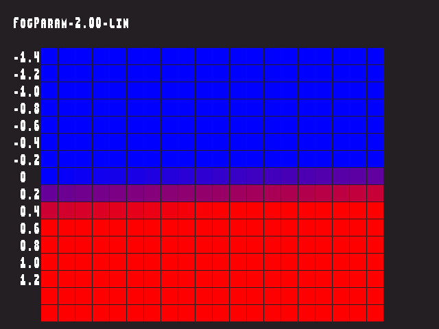 Tests fog mode NV097_SET_FOG_MODE_V_LINEAR with the bias param set to the zero point for the type and the multiplier set to 2.0. Quads are rendered with fog coordinates starting at -1.4 and increasing by 0.01 per quad.