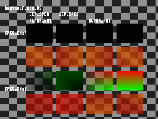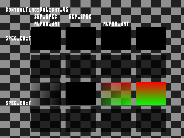 The upper two rows have SET_SPECULAR_ENABLE = false. The lower rows have it true. The first column has SET_LIGHT_CONTROL = SEPARATE_SPECULAR + ALPHA_FROM_MATERIAL_SPECULAR The second has SET_LIGHT_CONTROL = SEPARATE_SPECULAR The third has SET_LIGHT_CONTROL = ALPHA_FROM_MATERIAL_SPECULAR The fourth has SET_LIGHT_CONTROL = 0